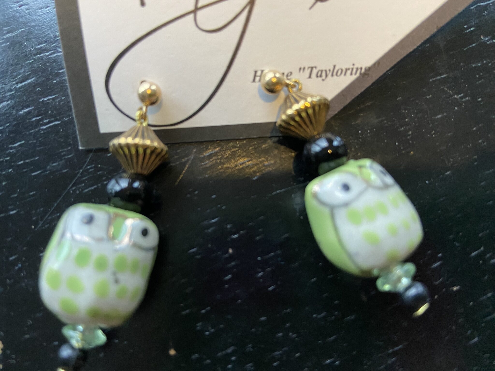 Handmade dangle earrings with ceramic green owls, green, gold and black beads on gold tone posts. 1 3/4” long Great for owl lovers or pretty green for spring casual wearing. Great gift too!