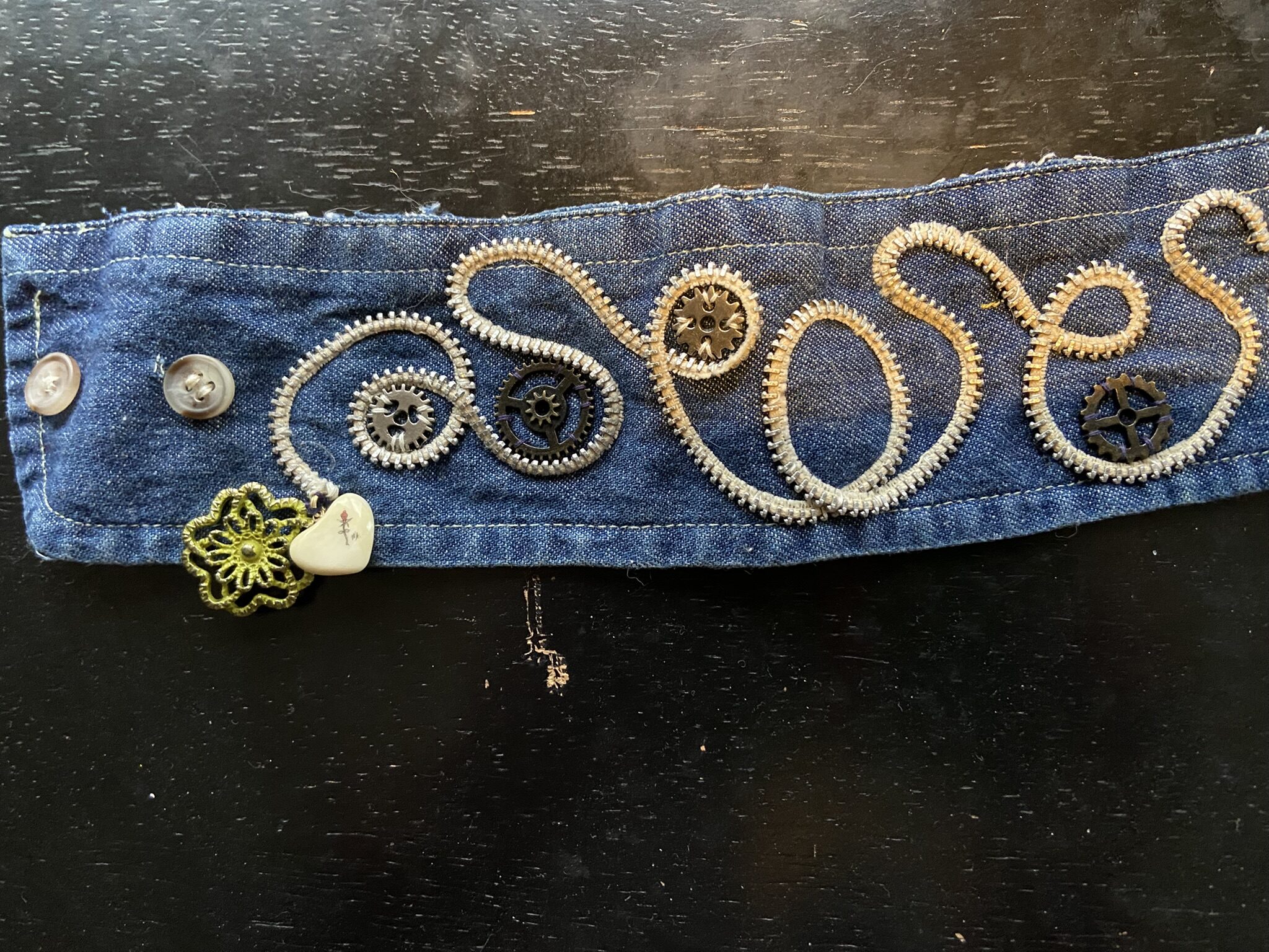 Handmade one of a kind upcycled cuff bracelet made a cuff off of a thrift store shirt, a zipper from a thrift store shirt, a heart charm, earring part, and decorative gear parts. Measures 10” end to end and 2 1/2” wide then 9 1/4” from button to middle of button hole closure. Fun to add to a casual outfit.