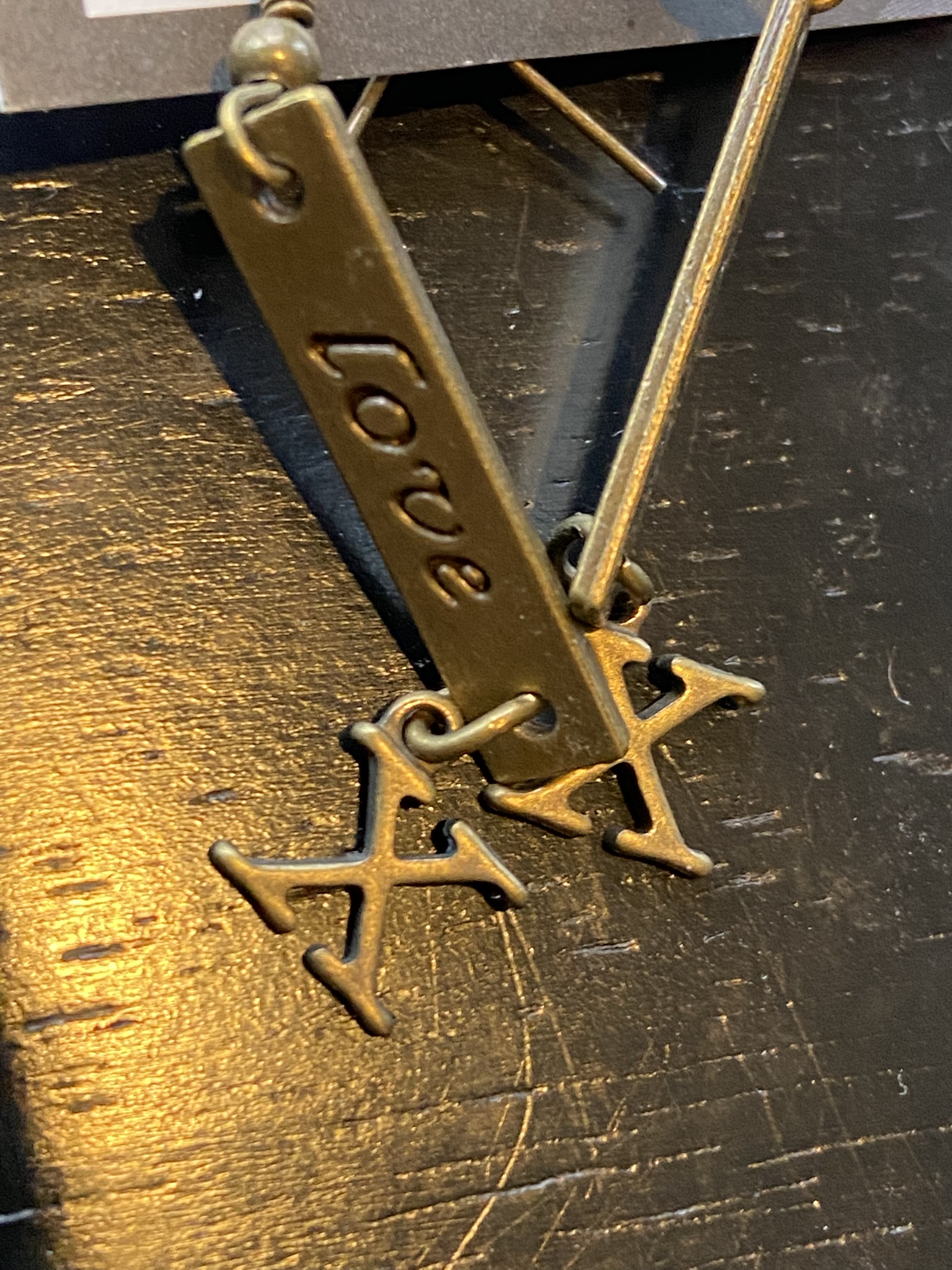 “Love X” dangle handmade for pierced ears in an antique bronze color metal. Measures 2” long. Ear wire with clear rubber stopper, light weight. “Love” written in script on one side only, with the letter “X” dangling under it, read as “Love x”.  Like kisses.  Great for casual wear.  Super gift idea