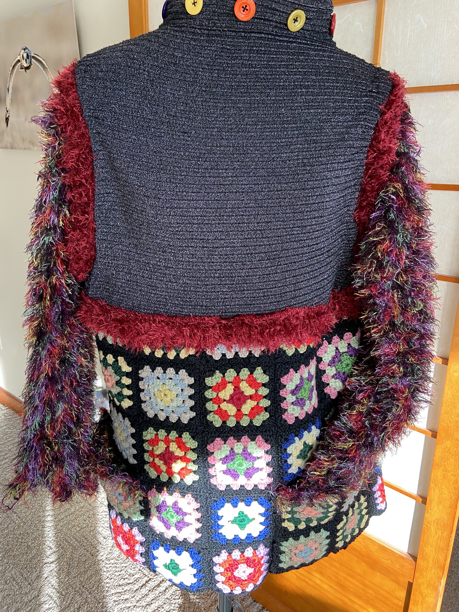 Fabrics: unknown, but the granny squares are yarn , the black glittery top is a stretchy knit of some kind, the sleeves are a knit stretchy scarf and the maroon trim is a fuzzy knit of some type with plastic buttons. 2 pockets on front accented with sleeve fabric. Garment is marked Large, but has been reconstructed so see measurements below. Colors: black, maroon, green, purple, rose, yellow, blue, orange, red, pink peach, teal, amber, gray *see photo for colors