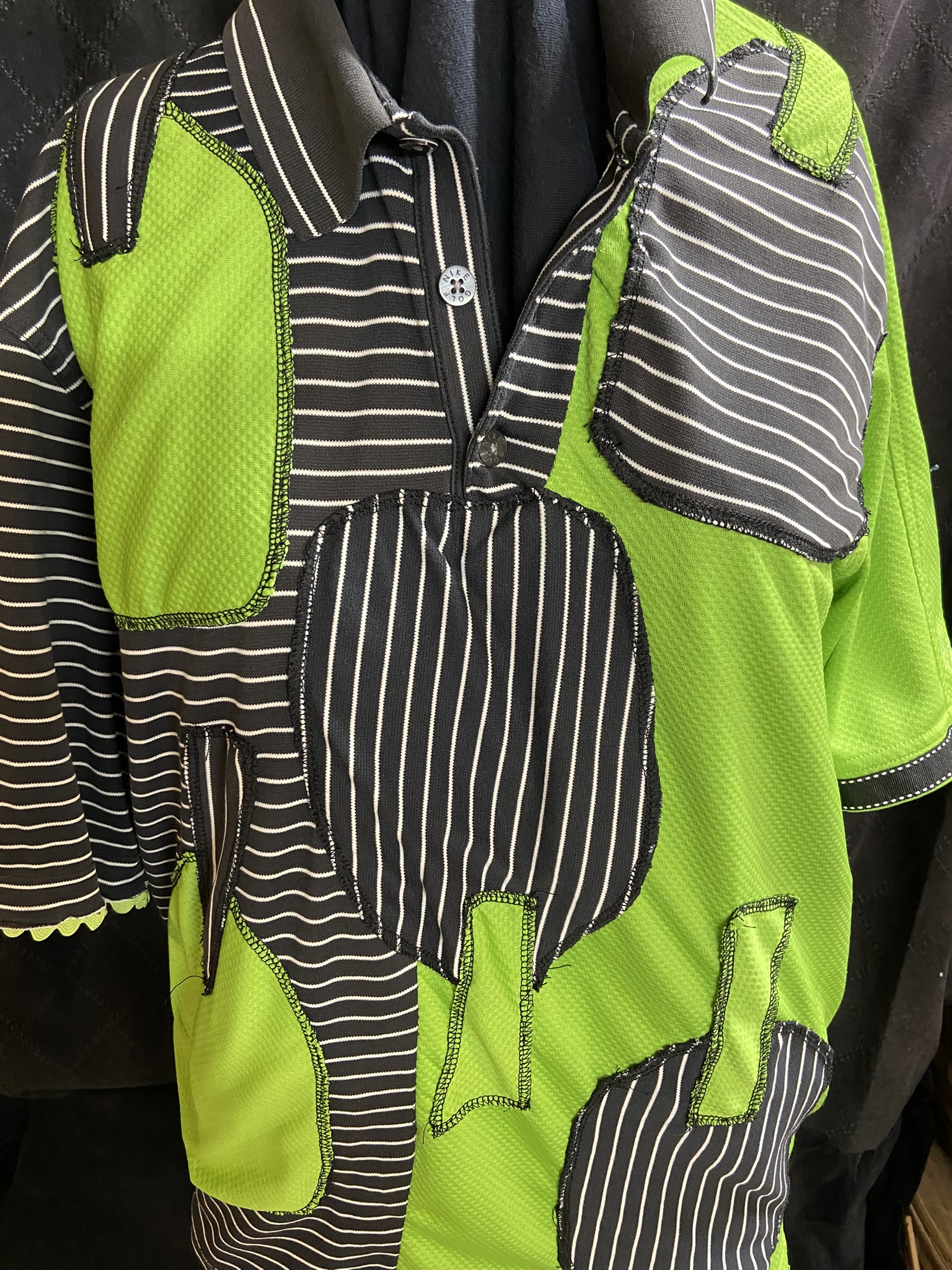 “Kelley” The upcycled top has been turned from 2 Men’s sport shirt cut in half then resewn into a women’s unique fun pickleball theme shirt to wear. Show the sport you love, with this thrift store Men’s Medium of bright kelly green solid and black and white stripe on the other half. The front and back are covered with handmade appliqued pickleball paddles in the contrasting fabrics….kind of a wallpaper look with pickleball paddles. There is one pickleball on the back appliqued. On the hem of the sleeve one has black ribbon with white dashes, and the other a green zig zag trim. All made with thrifted knit shirts. Fabrics:: The green fabric is 100% poly, the black/wht stripe is 64% cotton and 36% poly. Since all are thrift store items the fabrics have been washed before reconstruction began. This is a NON RETURNABLE ITEM! Please take note of the measurements below. Please measure a favorite outfit (not while on yourself) laid out on a flat surface, and compare the measurements I have provided. Also take into consideration the fabrics…knits/acrylic/poly give a little, cottons do not. If you have any questions about this garment please contact me prior to purchasing. I will gladly send you more photos. The current photos were taken inside under natural light and also under recessed lighting in a smoke free home.